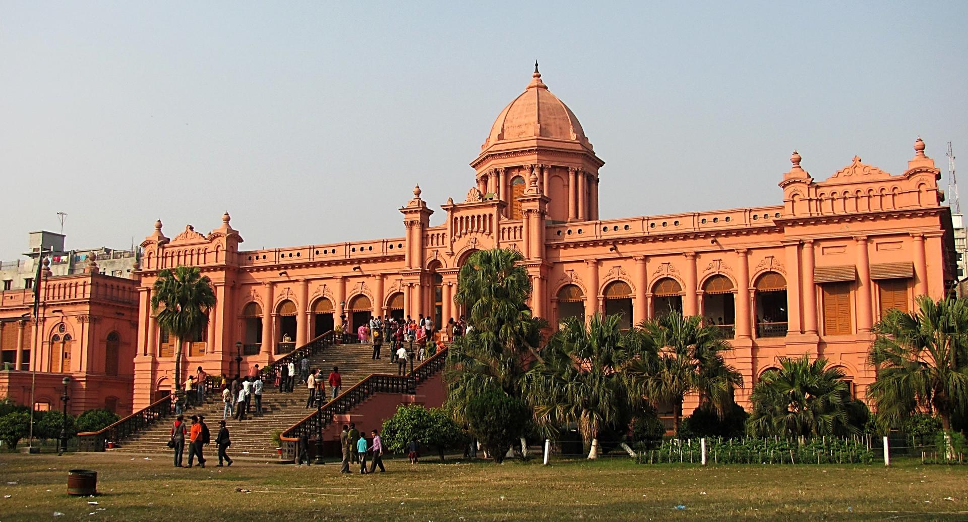 Sau bữa sáng, Quý khách dành cả ngày khám phá Dhaka. Những công trình kiến trúc đẹp nhất thành phố được xây trong hai thời kỳ Mughal và Anh. Ghé thăm Ahsan Manzil (আহসান মঞ্জিল), cung điện tráng lệ tọa lạc bên bờ sông Buriganga, nổi tiếng với công trình đá màu hồng nên được gọi là Cung điện hồng. Ahsan Manzil có 31 phòng, mái vòm lớn đỉnh cao 27 m trông giống như một nụ sen có thể được nhìn thấy cách đó gần chục km ở mọi hướng. Cung điện được xây dựng vào năm 1872 vào Thời thuộc địa Anh (British Raj-era), trang bị các vật dụng nội thất kiểu Anh. Ban đầu, cung điện dành làm tư dinh của Nawab of Dhaka, tước vị của đại địa chủ thế tập (zamindar) được hiểu như một dạng lãnh chúa Hồi giáo địa phương. Ahsan Manzil đã đổi chủ khá nhiều lần, và từ năm 1985 cung điện thuộc về Chính quyền Bangladesh.