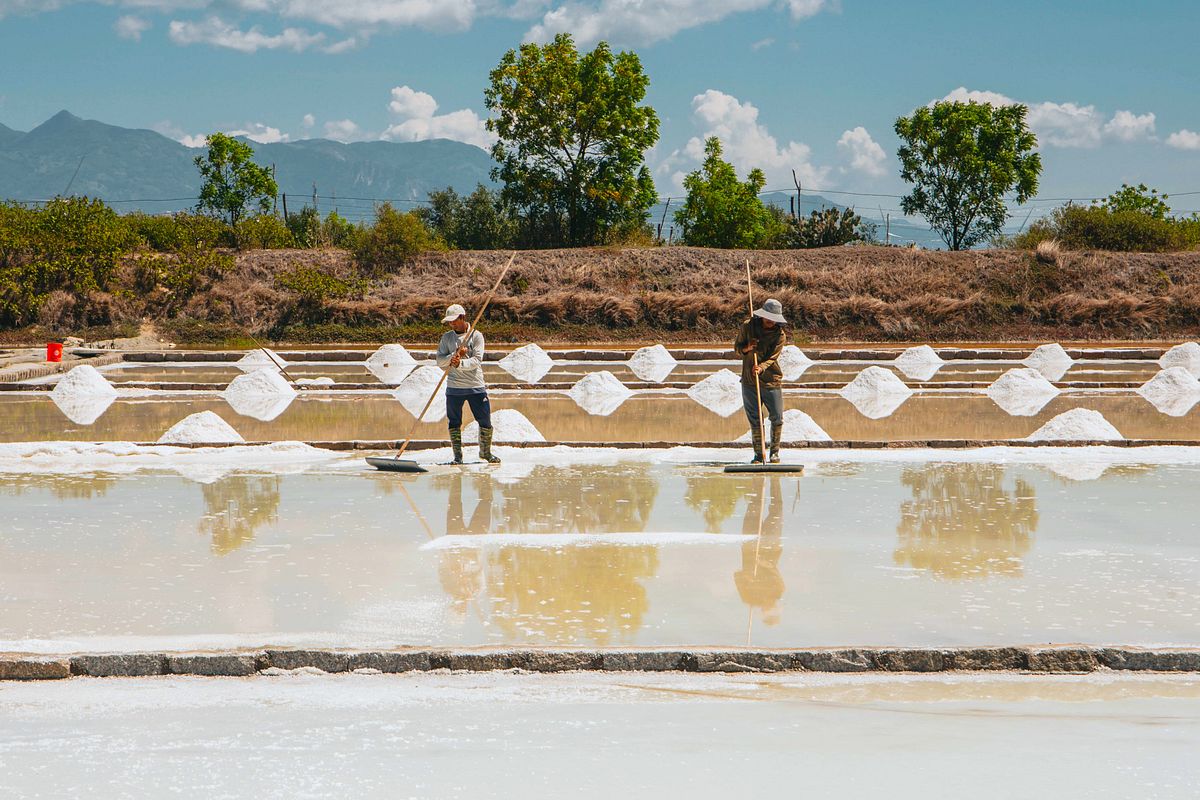 Quý khách được ngắm nhìn những ruộng muối trải dài đến hàng chục héc ta, vẻ đẹp lao động của người diêm dân, bên những ụ muối, những ô ruộng đẫm nước. Những diêm dân cần mẫn cào muối, gánh muối rồi chất thành từng ụ muối trắng xóa.